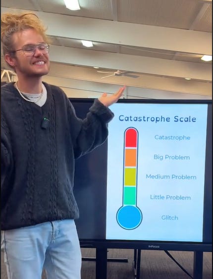 His scale has 5 categories, from least worrisome to worst: Glitch, little problem, medium problem, big problem, and catastrophe.